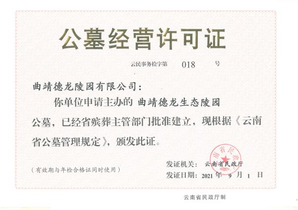 德龍園聚翠山之靈秀,依文脈而規(guī)劃,經(jīng)云南省民政廳批準(zhǔn)建設(shè),規(guī)劃用地一共520畝,經(jīng)過精心設(shè)計(jì),精細(xì)施工,于2021年9月取得《公墓經(jīng)營許可證》并投入使用。